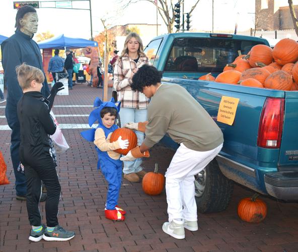 Wyatt Dressler grabs a pumpkin at the Downtown Farmers Market on Saturday. Dressler, who was wearing a one of many kids taking part in the annual Downtown Beloit Association Halloween Parade.