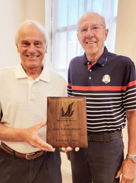 Gary Dencker, left, president of the Beloit Art Center Board, and Jerry Sveum, Art Center board member, pose with the Berk Service Award which was presented to the Beloit Art Center at the Annual Association of Wisconsin Artists Statewide Conference. Photo provided