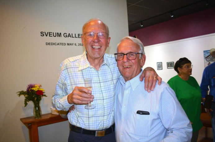 Jerry Sveum, left, poses with Art Carl at the Beloit Art Center on Saturday when the main gallery was named the Sveum Gallery. Sveum and Carl worked together as pharmacists for 40 years at the Grand Avenue Pharmacy.