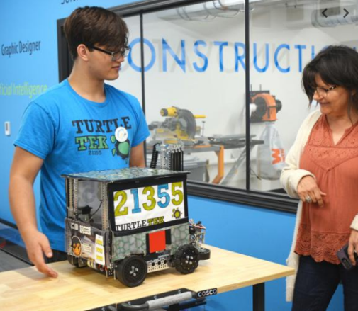 Xavier Miller shows his robotics project to visitors to Hendricks CareerTek during an open house
