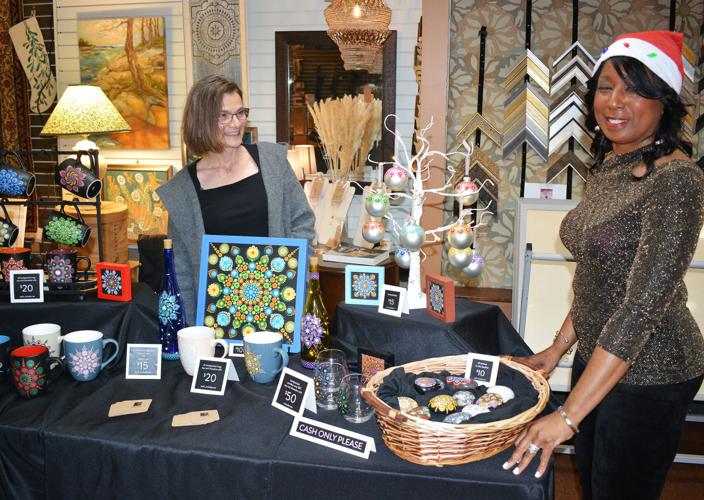 Jean Oseth of Akuba Studios, shows some of her items to Regina Dunkin at the Villager Gallery and Framing in downtown Beloit Friday. The Villager Gallery was one of the businesses that hosted specialty vendors during the Holidazzle event.