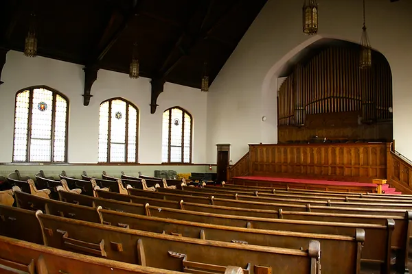 The Sanctuary – A spectacular pipe organ is the focal point of an acoustically balanced room with a soaring ceiling and tastefully understated gothic architecture. Large stained glass windows cast filtered light on curved oak pews. Seating up to 340 people and boasting a full size movie screen, the sanctuary is ideally suited for music, multi-media presentations, lectures, weddings or small expos.