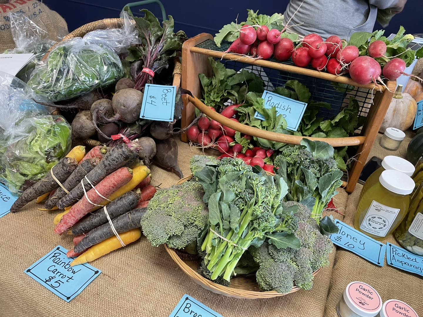 Offering: arugula, asparagus, basil, green beans, beets, blackberries, blueberries, bok choy, broccoli, broccolie rabe, brussels sprouts, cabbage (green, purple), cantaloupes, carrots, cauliflower, celeriac, celery, collards, corn (ornamental, pop, sweet), cucumbers, eggplant, fennel, flowers, garlic (bulb, scapes), gourds, herb (seedling, fresh), honey, jicama, kale, kohlrabi, leeks, lettuce, melons, mesclun, mustard greens, okra, onions, oregano, parsley, parsnips, sugar snap peas, peppers (hot, green, purple, red, yellow), plants, potatoes, preserved/fermented vegetables, radishes, raspberries (black, red), rhubarb, rosemary, sage, scallions, shallots, spinach, squash (summer, winter), strawberries, sweet potato greens, sweet potatoes, swiss chard, thyme, tomatillos, tomatoes, turnips, vegetable seedlings, watermelon