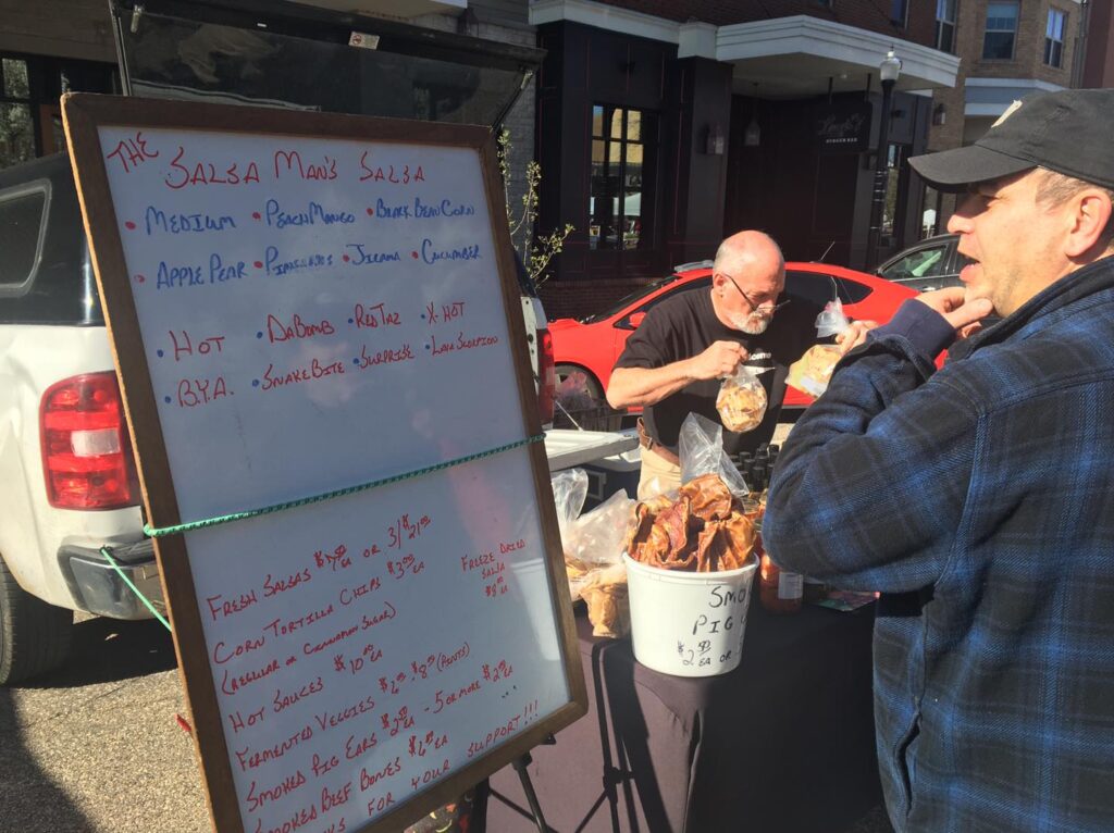 Weekly offerings of fresh salsa and two types of corn tortilla chips, salted and cinnamon sugar (both gluten free). Additionally, you will find an assortment of hot sauce, some of which are fermented. I also offer my fresh salsa in a freeze-dried form for use as seasonings, spices or rubs. Fermented honey-garlic, fermented honey-hot peppers, fermented veggies, refrigerator cucumbers, pickles, cold soups and a nice variety of fresh produce. For your dogs I have smoked pig ears and smoked bones.