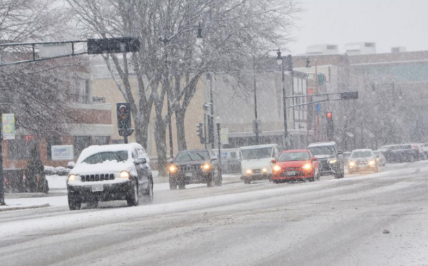 Motorists on State Street in downtown Beloit faced a snowy drive Thursday morning. Snow plows were scrambling to clear streets as the white stuff covered area roadways. No more snow is expected over the next few days. Friday will see high temperatures near 40 and Saturday will see highs in the mid 30s under partly cloudy skies.